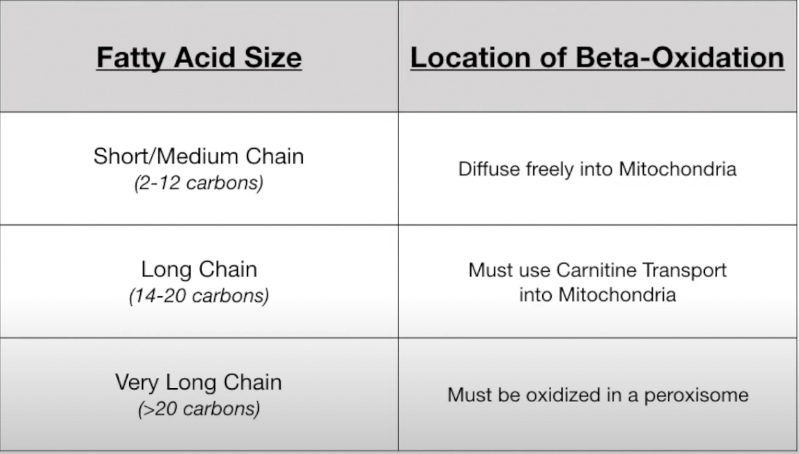 Where/how does the location of Beta-Oxidation of short/medium chain fatty acids occur?