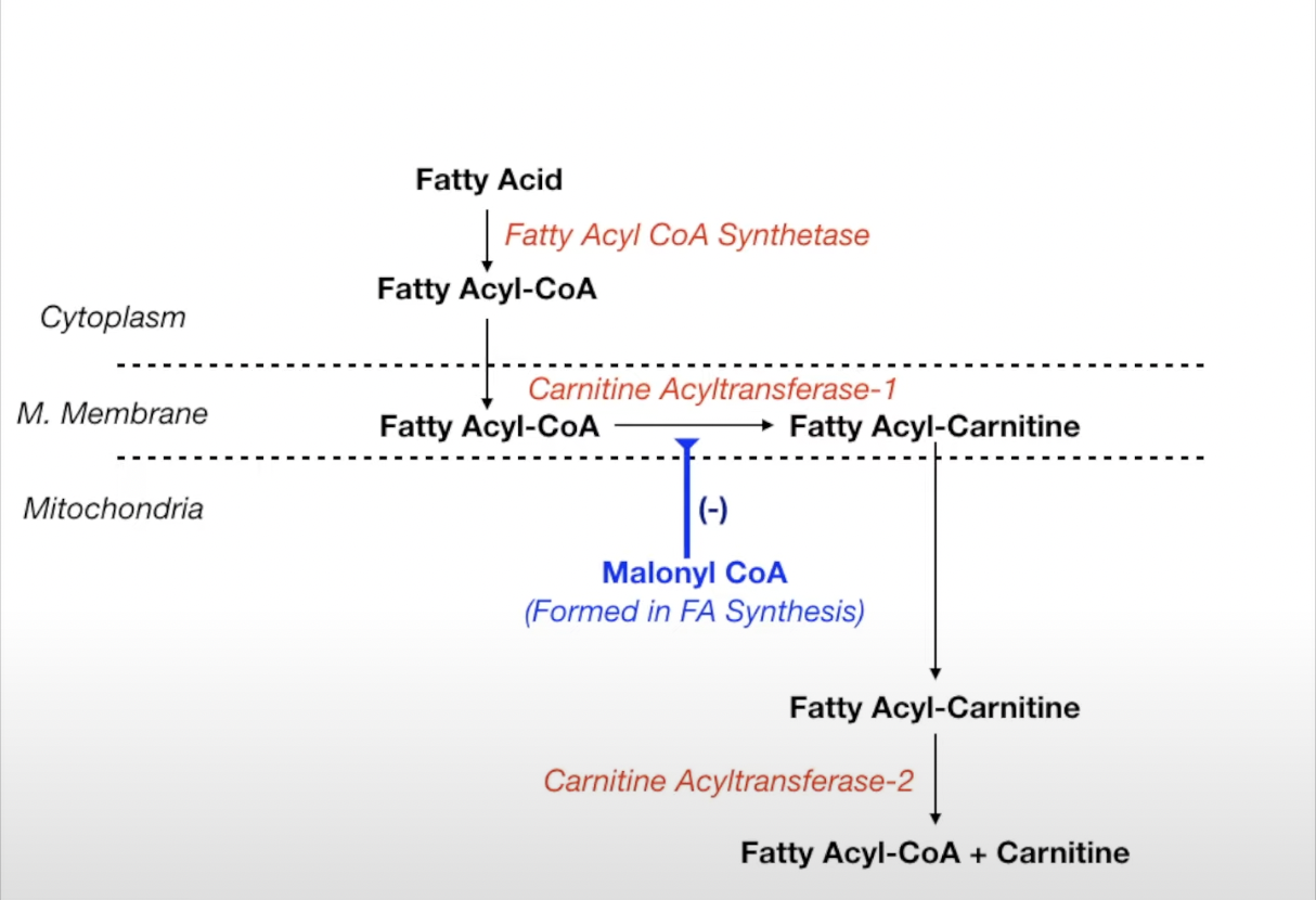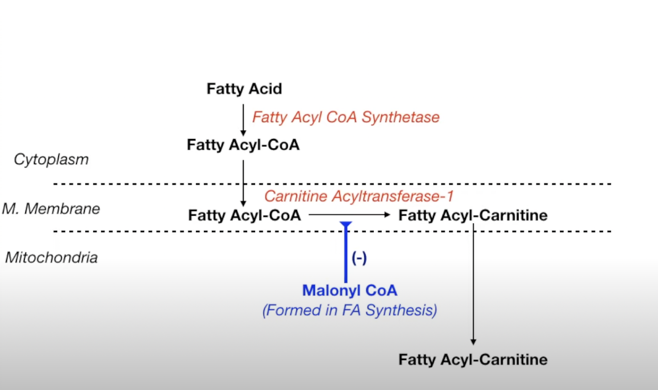 Presence of Malonyl CoA in mitochondria will inhibit b/c Malonyl CoA is a product of Fatty Acid Synthesis which will inhibit fatty acid breakdown.