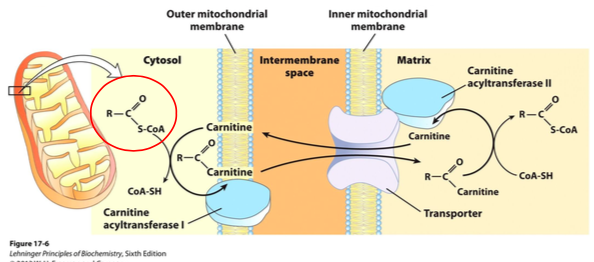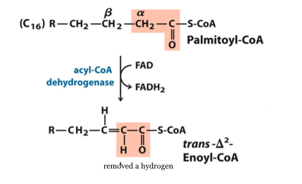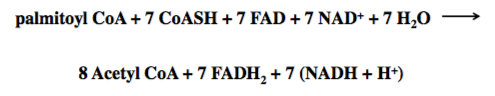 *if start with 16 carbon fatty acid, goes thorugh beta oxidation and get 14 fatty acid and actyl CoA*
