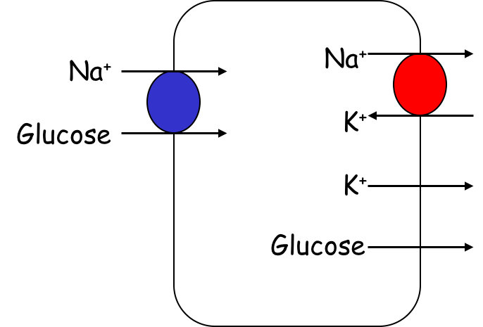 Na/K ATPase on the basolateral side as well as a K channel as well as a glucose channel