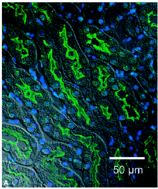 Rings of green staining is the apical membrane (brush border) - Suggests there is a K channel in the apical channel which is helping set up the driving force for Na reabsorption.