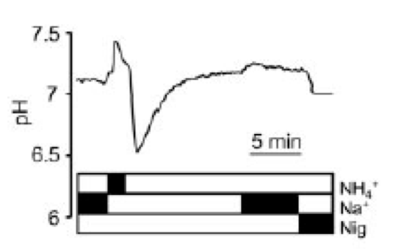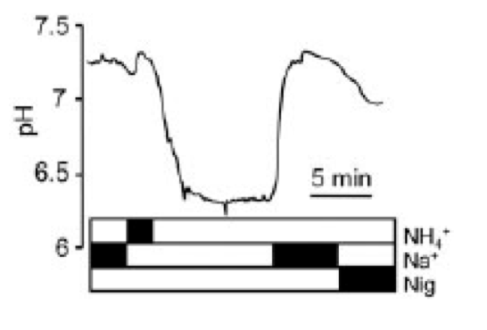 When you take away the extracellular solution there is a reversal in the driving force. NH4 again dissociates and moves back out the cell, creating a large acidification (as more H ions are left inside the cell then previously). This acidification causes an upregulation of acid secretion mechanisms