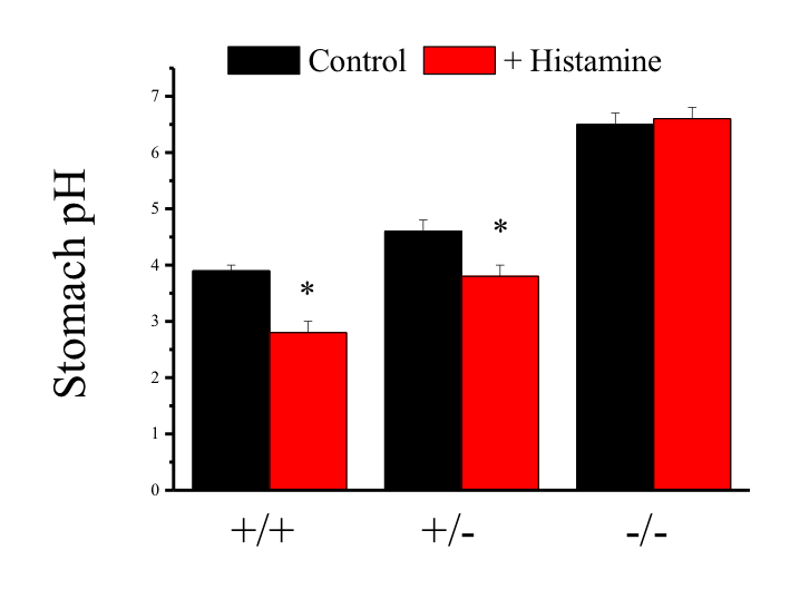 In KCNE2 KO homozygotes, the baseling pH is more alkali and there is no response to histamine.