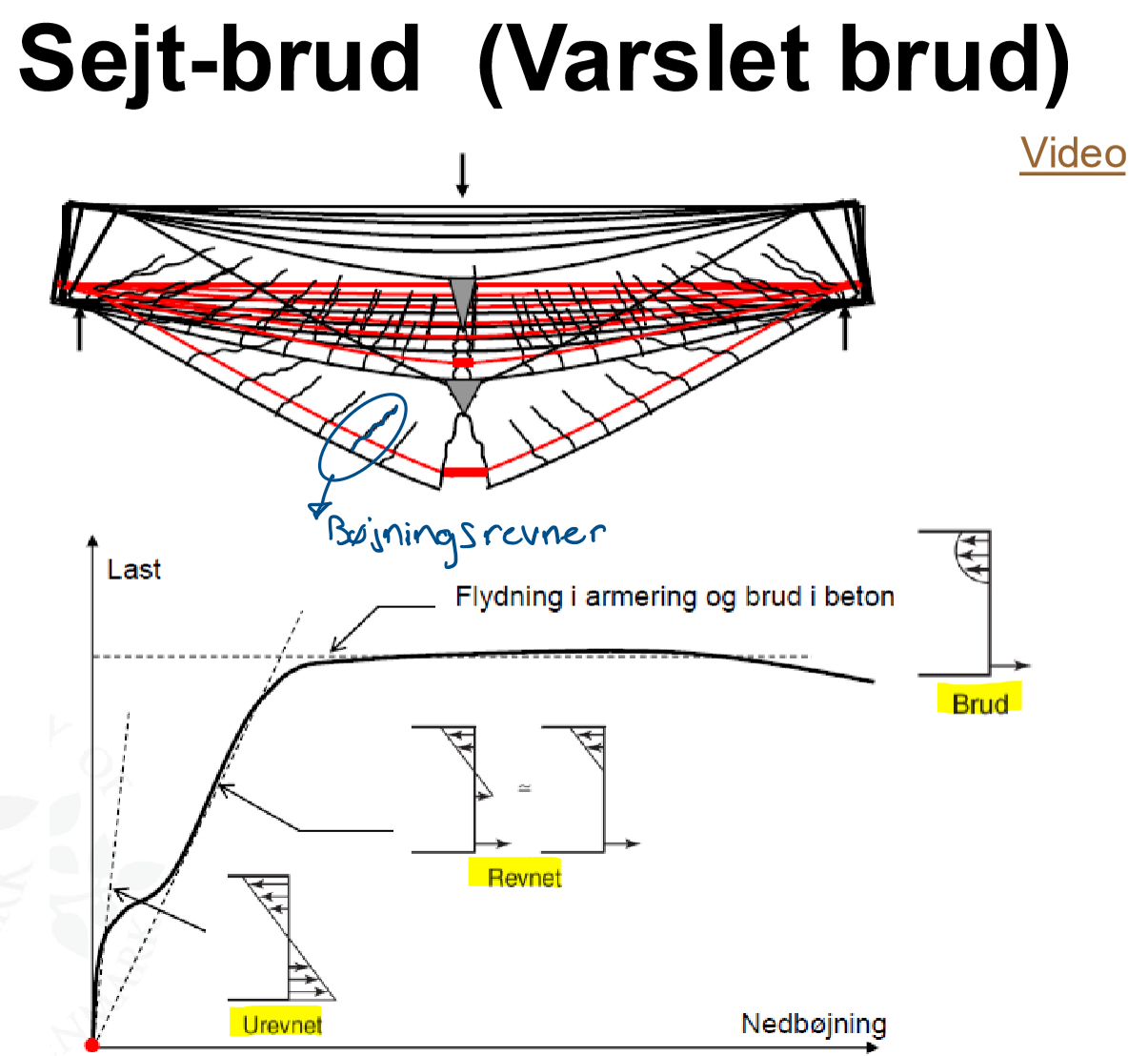 Forklar de forskellige stadier for sejt-brud (varslet brud) i en “arbejdslinje” for armeret beton