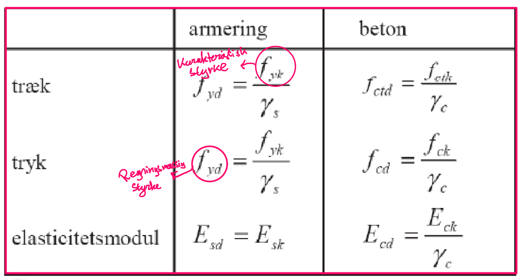 Hvordan beregnes de regningsmæssige materialestyrker? (For hver armering og beton)