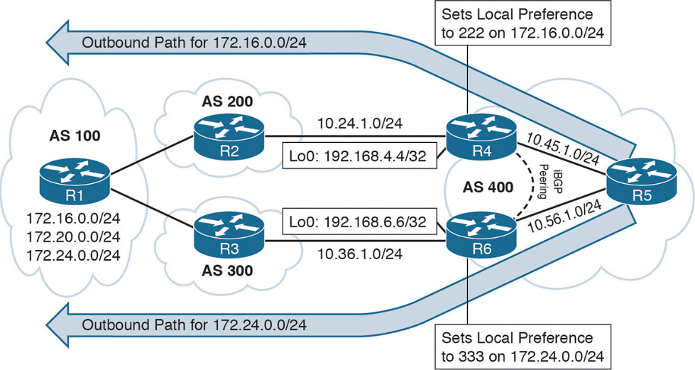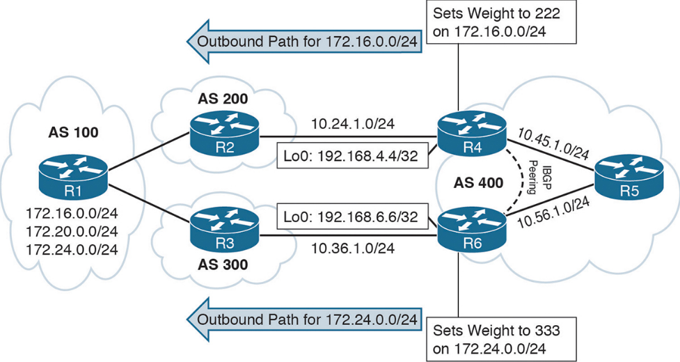 R6 is an edge router for AS 400 and sets the weight to 333 for the 172.24.0.0/24 prefix received from R3. This ensures that R6 uses R3 for outbound traffic to this prefix.