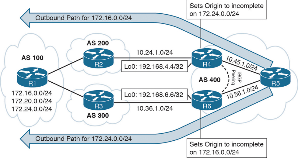 R6 sets the origin to incomplete for the 172.16.0.0/24 path received from R3, making it the least preferred path for R4, R5, and R6.