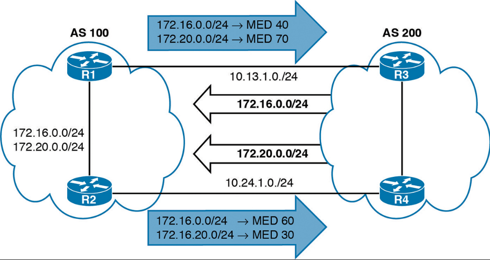 R4 sets the MED to 40 for 172.16.0.0/24, 50 for 172.20.0.0/24, and 90 for 172.24.0.0/24.