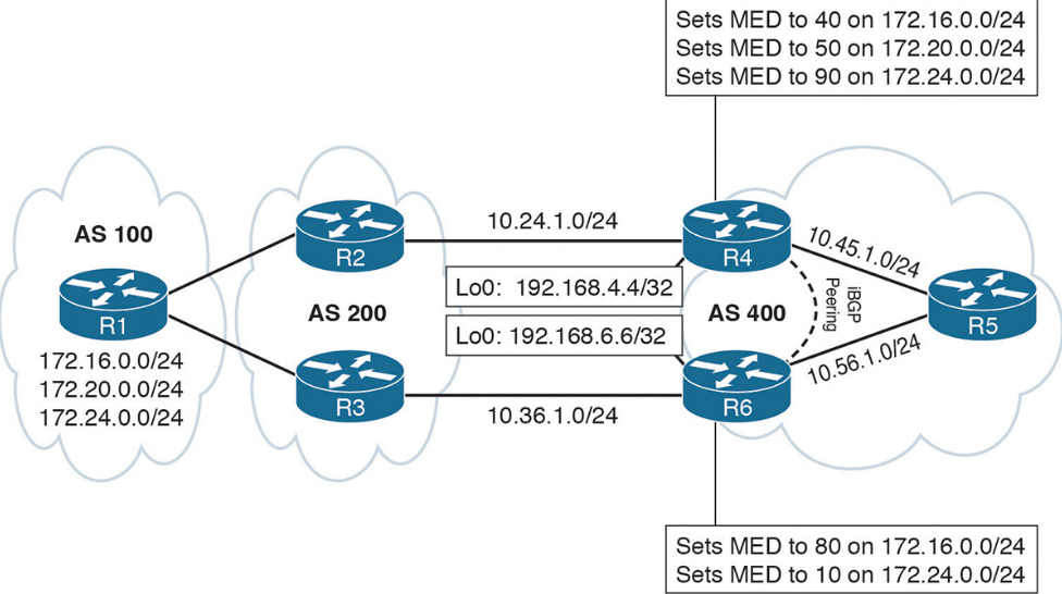 R4 advertises the 172.16.0.0/24 prefix with a MED of 200, and R5 selects R4’s path as the best path because no other paths exist.