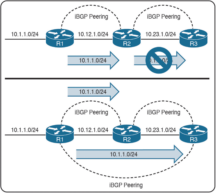 R1 has an iBGP session with R2, and R2 has an iBGP session with R3.