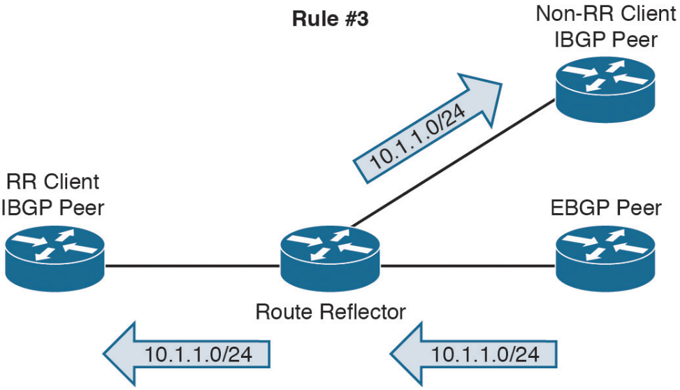 Rule 3: A route learned from an eBGP neighbor can be forwarded to another eBGP neighbor, a client and non-client.