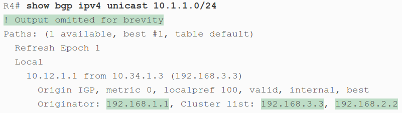 Even the RR client that sent the advertisement receives a copy of the route, but it discards the NLRI because it sees itself as the route originator.