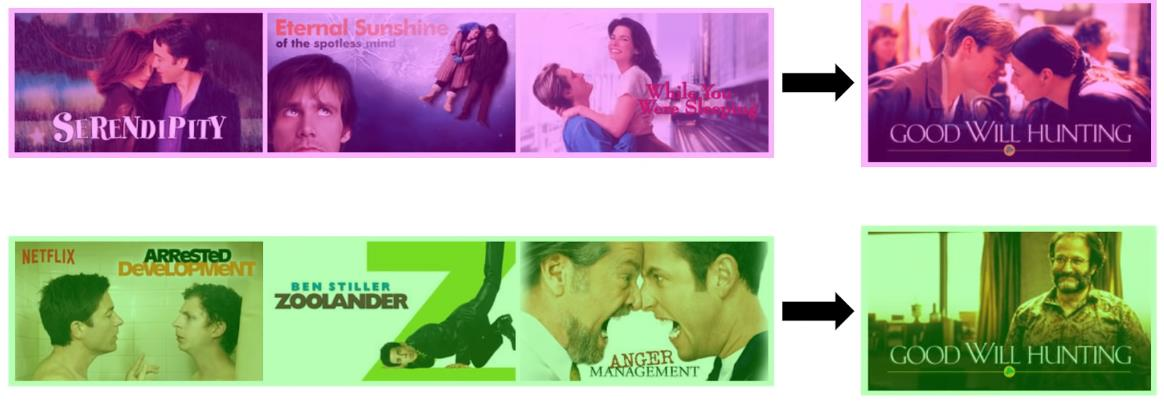 Observe a imagem: há duas imagens diferentes para o mesmo filme! No entanto, se você gosta mais de assistir filmes românticos, ele mostrará uma imagem do filme com o Matt Damon beijando uma mulher; se você gosta mais de assistir filmes de comédia, ele mostrará uma imagem do mesmo filme, porém com Robin Williams.