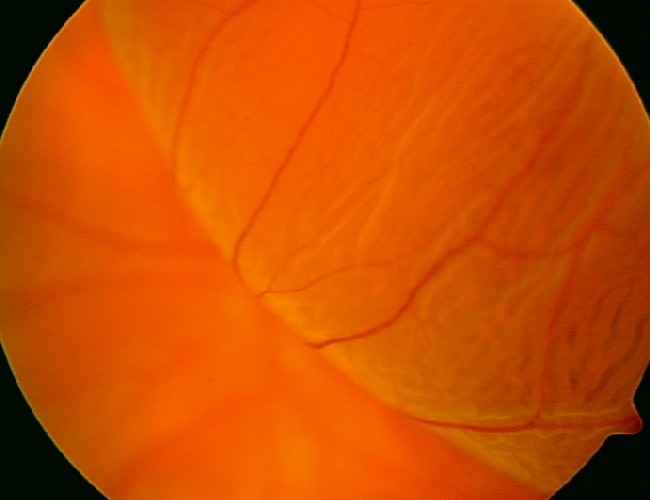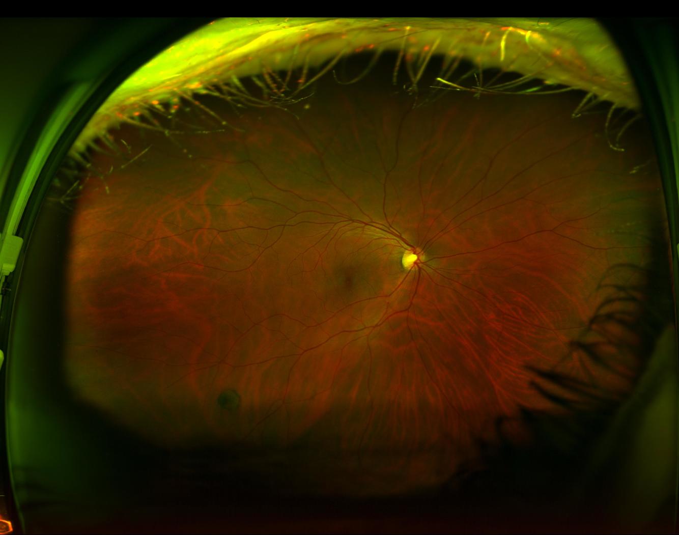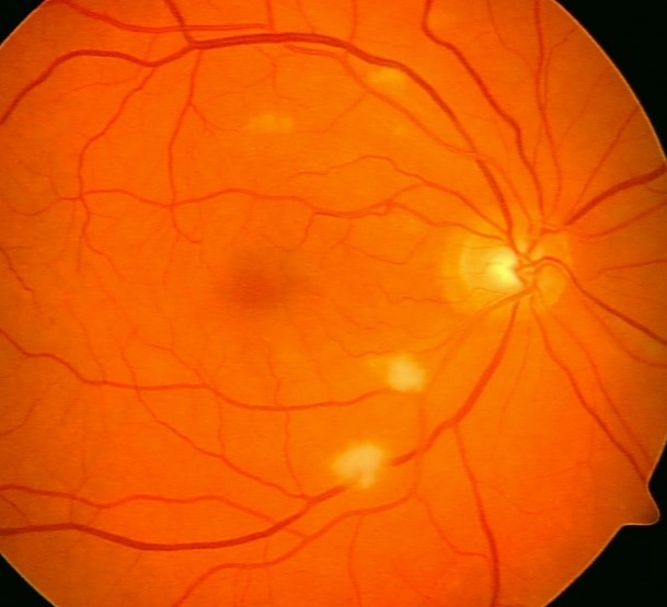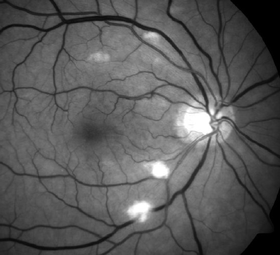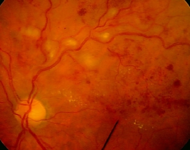 Ved oftalmoskopi av det høyre øyet er det godt innsyn til en velavgrenset papille med normal ekskavasjon. I tillegg sees det dårlig fylte kar, multiple bløte eksudater, lette krysningsfenomener og noe kaliberveksling.Det akutte forløpet kan tyde på en vaskulær lidelse, mest sannsynlig i arteriene(sentralarterieokklusjon), sykdom i venene utvikler seg vanligvis ikke like raskt. Når pasienten er hos øyelegen og det tas bilder er det allerede gått en uke siden det aktuelle, og øyebunnen har endret seg noe. Arteriell okklusjon er en klinisk diagnose som baserer seg på symptomene akutt synstap, blek macula med “cherry red spot” og en relativ afferent pupilledefekt. Pga. det forsinkede tidsaspektet vil man ikke se “cherry red spot” så tydelig på bildene nå.