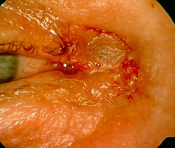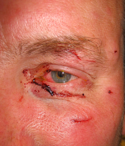 Han ble angrepet av stor ugle da han kikket på et reir med ugleunger, med skader fra klør og nebb mot ve side av ansiktet, dypeste lesjoner mot mediale kant av ve. øye, ved tårepunktet. En flik av konjunktiva ses hengende over nedre øyelokk. Litt hevelse ve side av ansiktet. Hvordan går du frem videre?