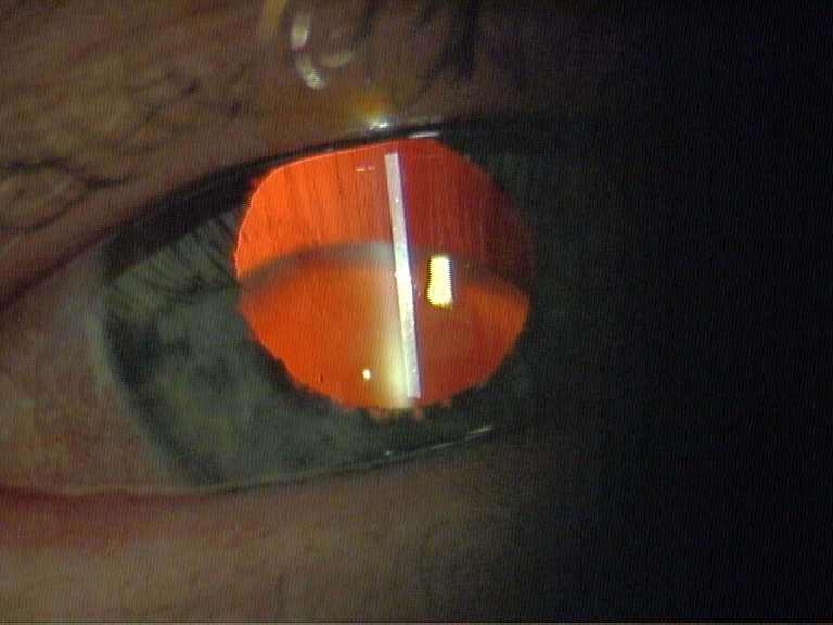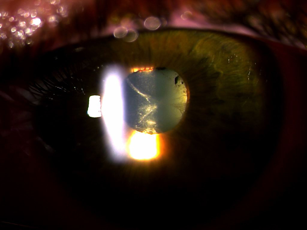 Medisinstudenten har en liten linseuklarhet på høyre øye. Hun spiller aktivt håndball på fritiden og har flere ganger fått kraftige slag mot hodet/øyet. Lesjonen er mulig traumatisk betinget. Små linseuklarheter kalles vanligvis ikke katarakt dersom de ikke gir nedsatt visus. Traumer er den vanligste årsaken til unilateral katarakt hos unge mennesker.