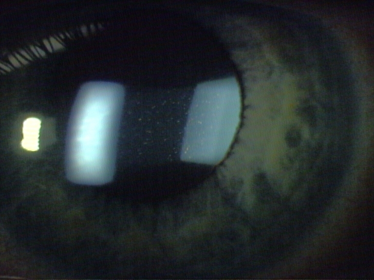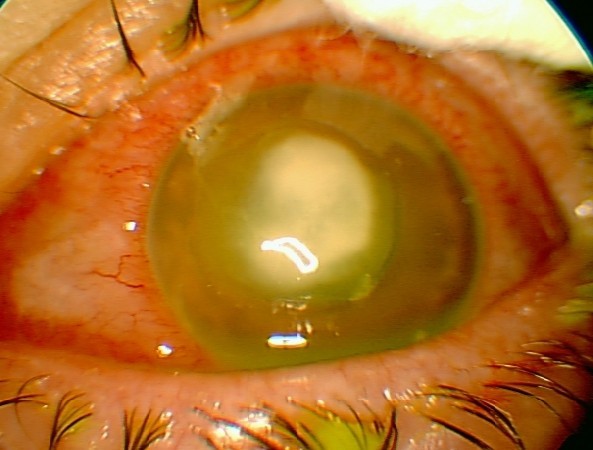 Øyet er injicert og smertefullt, i tillegg finnes en hvit opacitet/flekk på kornea. Dette er forenlig med en bakteriell keratitt. Pasienten bruker kontaktlinser og man bør vurdere infeksjon med Pseudomonas Aerguinosa