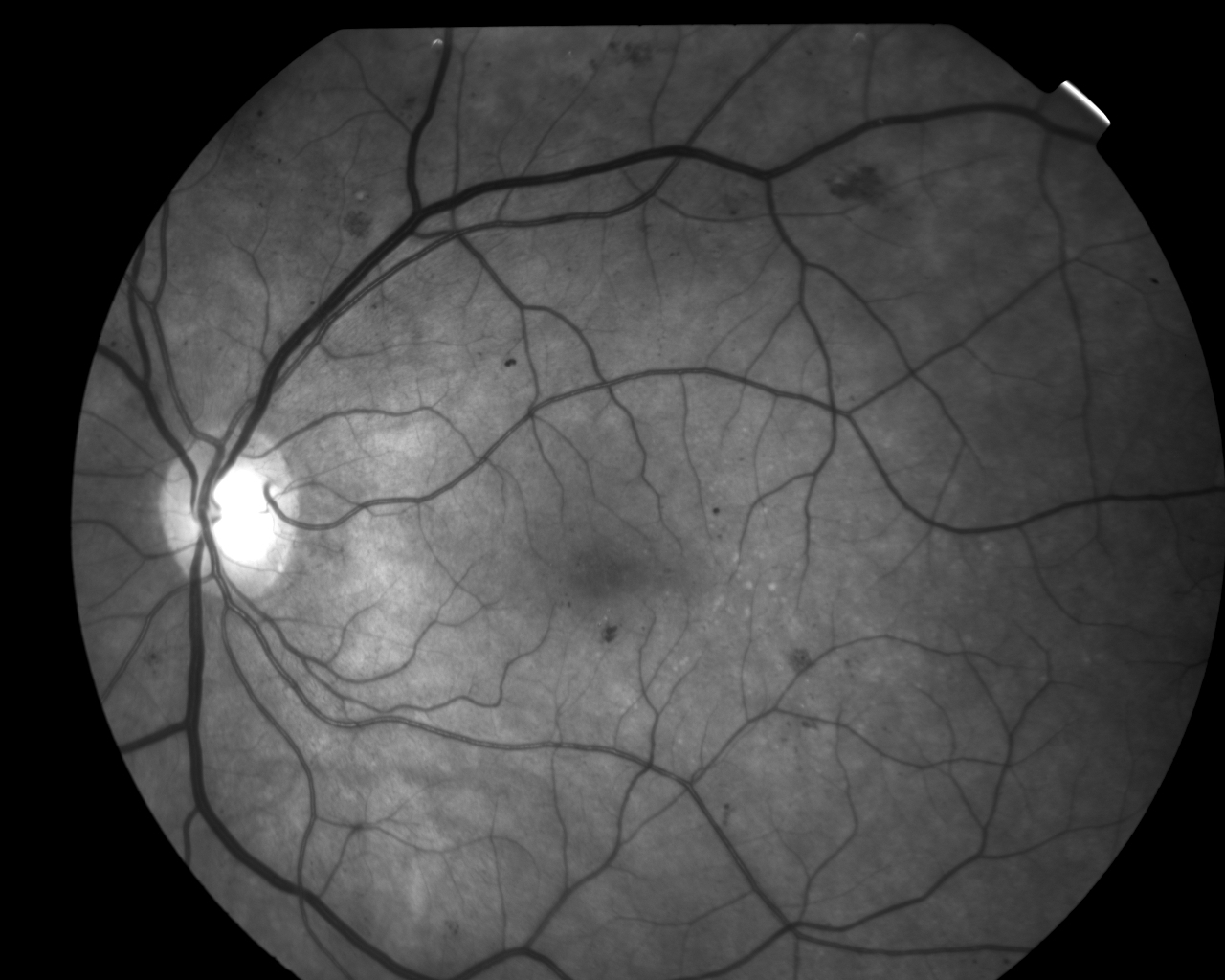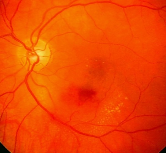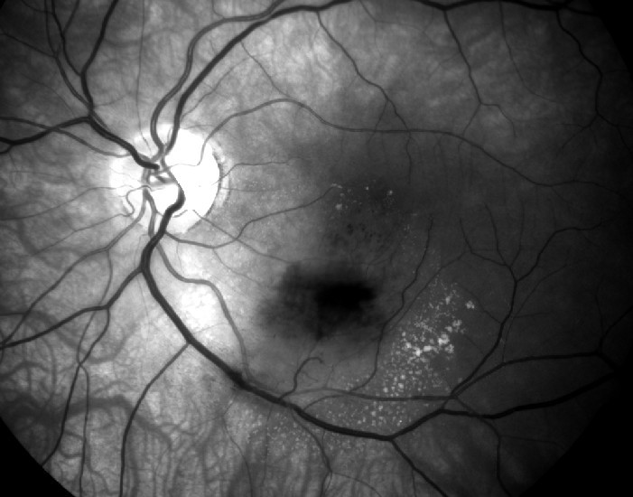 Anamnese og funn gir mistanke om maculasykdom o.s. Det mørke området er en retinal blødning, mest sannsynlig pga. en grenvenetrombose.Fluoresceinangiografi rekvireres. Bildene viste en retinal blødning nedenfor macula (svart på angiobildet) med noe lekkasje omkring.