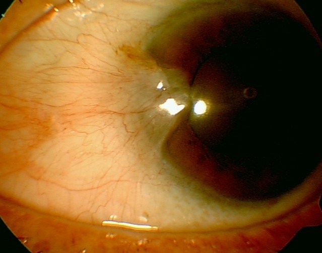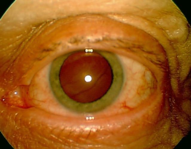 pterygium. Siden det har vokst noen millimeter over cornea ble han henvist til øyelege på lokal øyeavdeling som fjernet pterygiumet. Det ble limt på conjunctivalt autograft (conjunctiva fra samme øye) over defekten