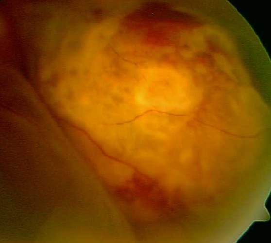 Oftalmoskopi etter dillatasjon: Høyre øye er normalt. Venstre øye: Godt innsyn til skarpt avgrenset papille. Aldersnormal macula. Nedad og temporalt ses en gråfarget blomkålliknende oppfylning med avløst netthinne over lesjonen. Det ble foretatt finnålsbiopsi som viste malignt melanom. Choroidalt malignt melanom er den hyppigst forekommende primærtumor i øyet. Vanligste metastase i øyet hos kvinner er spredning fra mammacancer, og den vanligste metastase hos menn er spredning fra bronchialcancer.