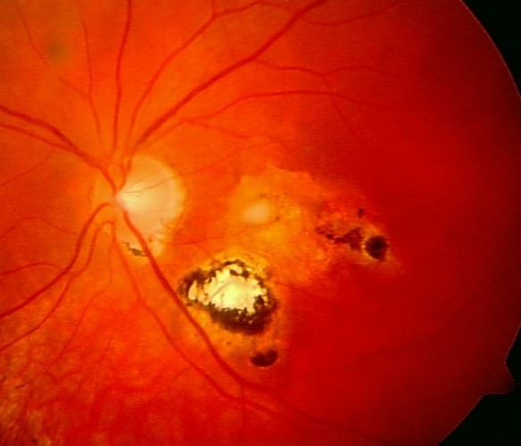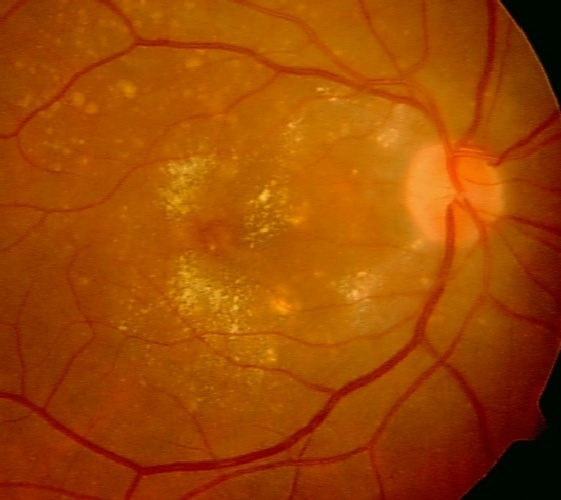 Mange større og mindre hvitlige flekker og grålige forandringer rundt makula. Undersøkelsene konkluderer med såkalt tørr AMD, altså uten ødem.