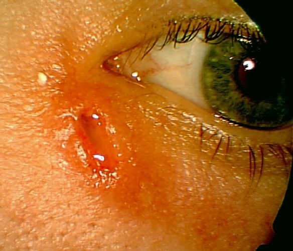injeksjon og hevelse over tåresekken, men lite smerter. Innholdet i sekken ser ut til å ha tømt seg ut gjennom huden. Ved palpasjon over tåresekken kommer det likevel litt puss ut fra punctum lacrimale inferior. Funnene er forenlige med en dacryocystitt, dvs. en betennelse i tåresekken. Dette skyldes en stenose i tåreveiene. Hos voksne oppstår passasjehindringen oftest i ductus lacrimalis. Pasienten får resept på en ny antibiotikakur og du henviser henne til øyespesialist for utredning av tåreveisstenosen. Det tas samtidig en bakteriologisk dyrkning. Pasienten settes opp til operasjon, en dacryocystorhinostomi.