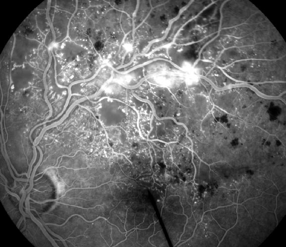 Ved oftalmoskopi av venstre øye er innsynet klart, og du ser i hele øvre del av fundus harde og bløte eksudater, små blødninger/aneurismer, større blødninger og krysningsfenomener (ses rett over papillen). Du synes konturene er litt utviskede, særlig i maculaområdet, forenlig med ødem. Det tas bilder og fluoresceinangiografi av fundus. Funnene er forenlige med grenvenetrombose som trolig har skjedd i karkrysningen rett oppad for papillen. (Se angiobilde.)