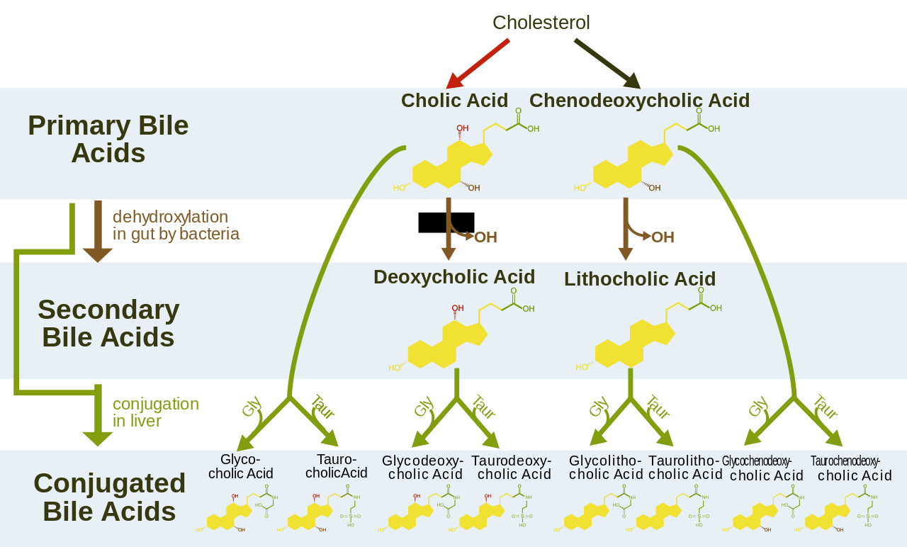 From cholesterol you get cholic acid or chenodeoxycholic acid. These are primary and can be conjugated with glycine or taurine.