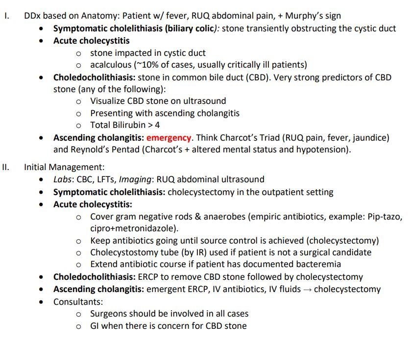 DDx and initial steps based on: Patient w/ fever, colicky RUQ abdominal pain, + Murphy’s sign