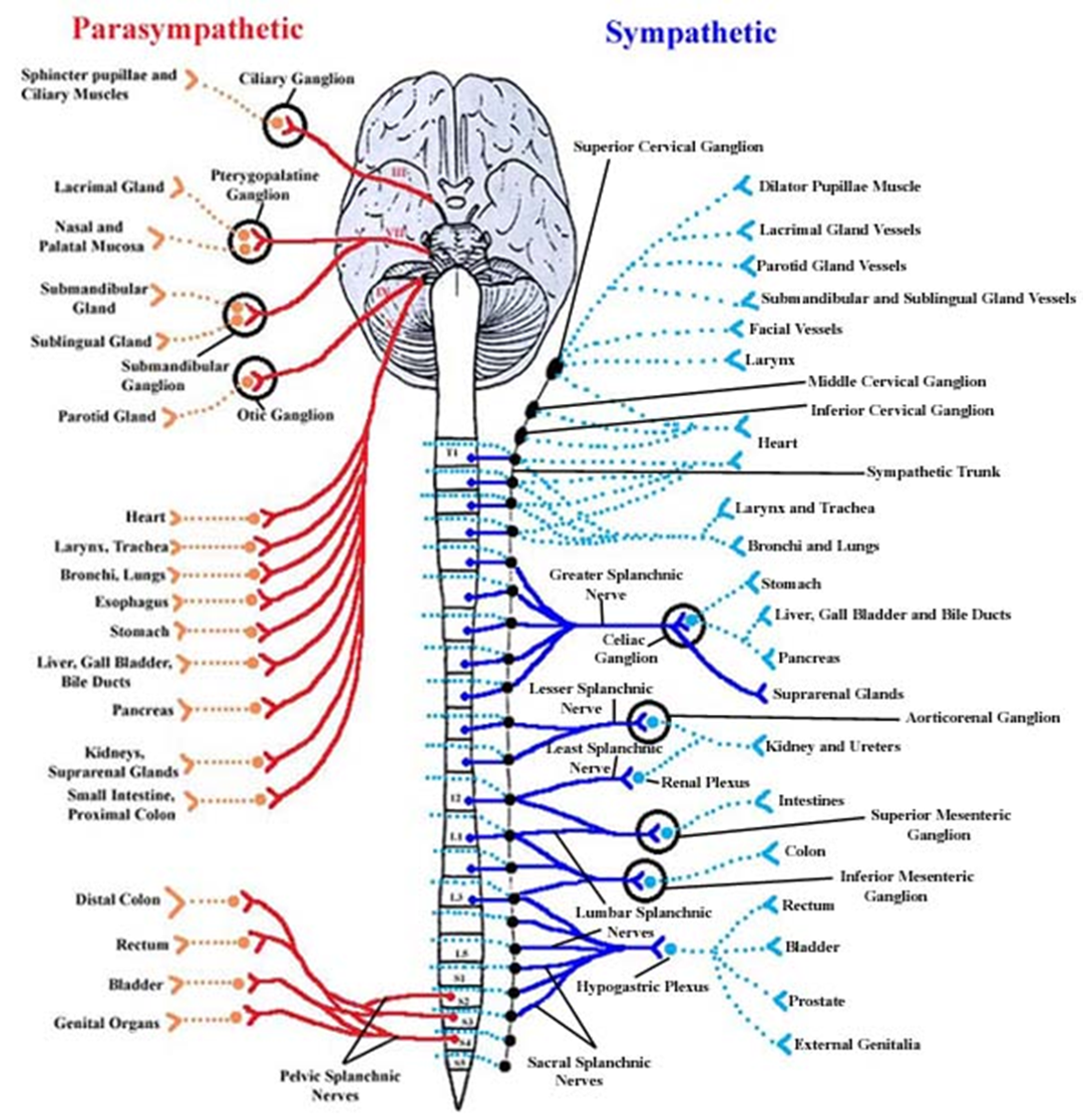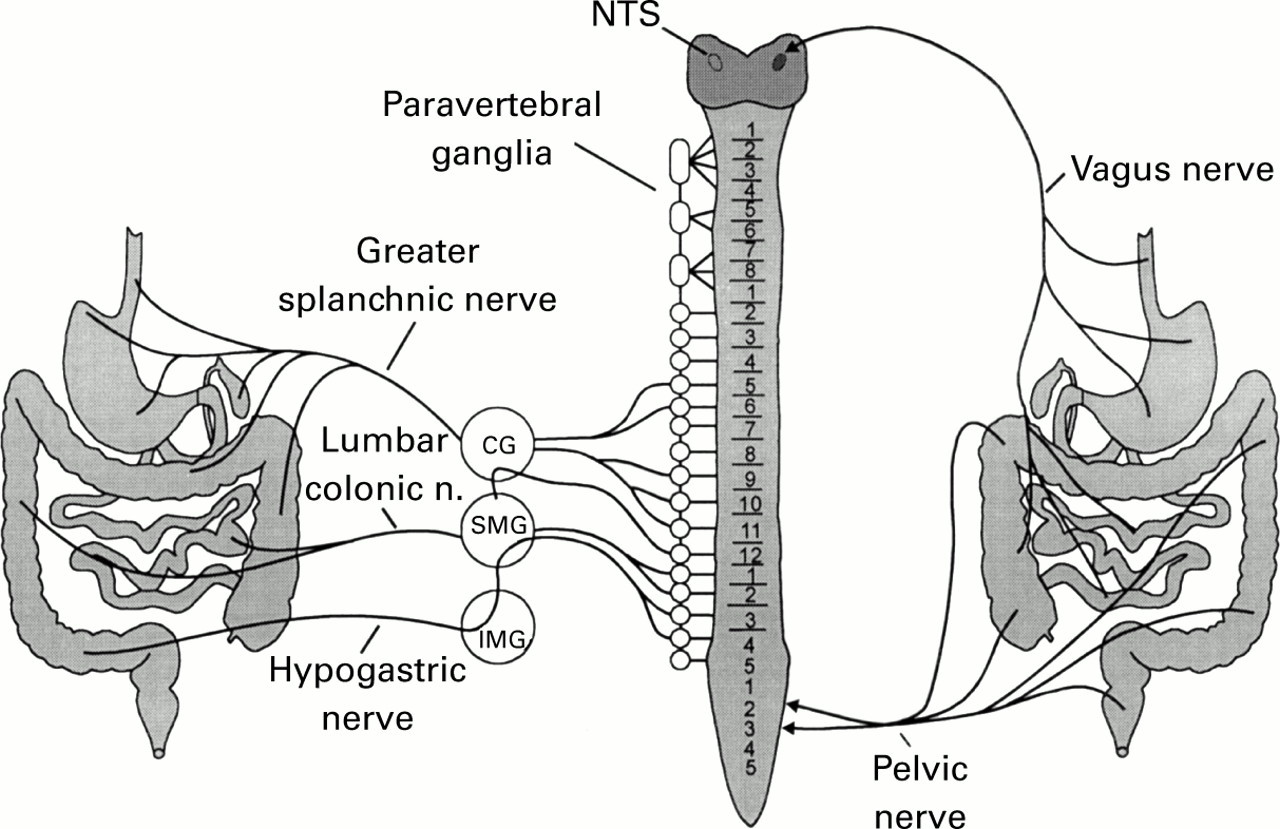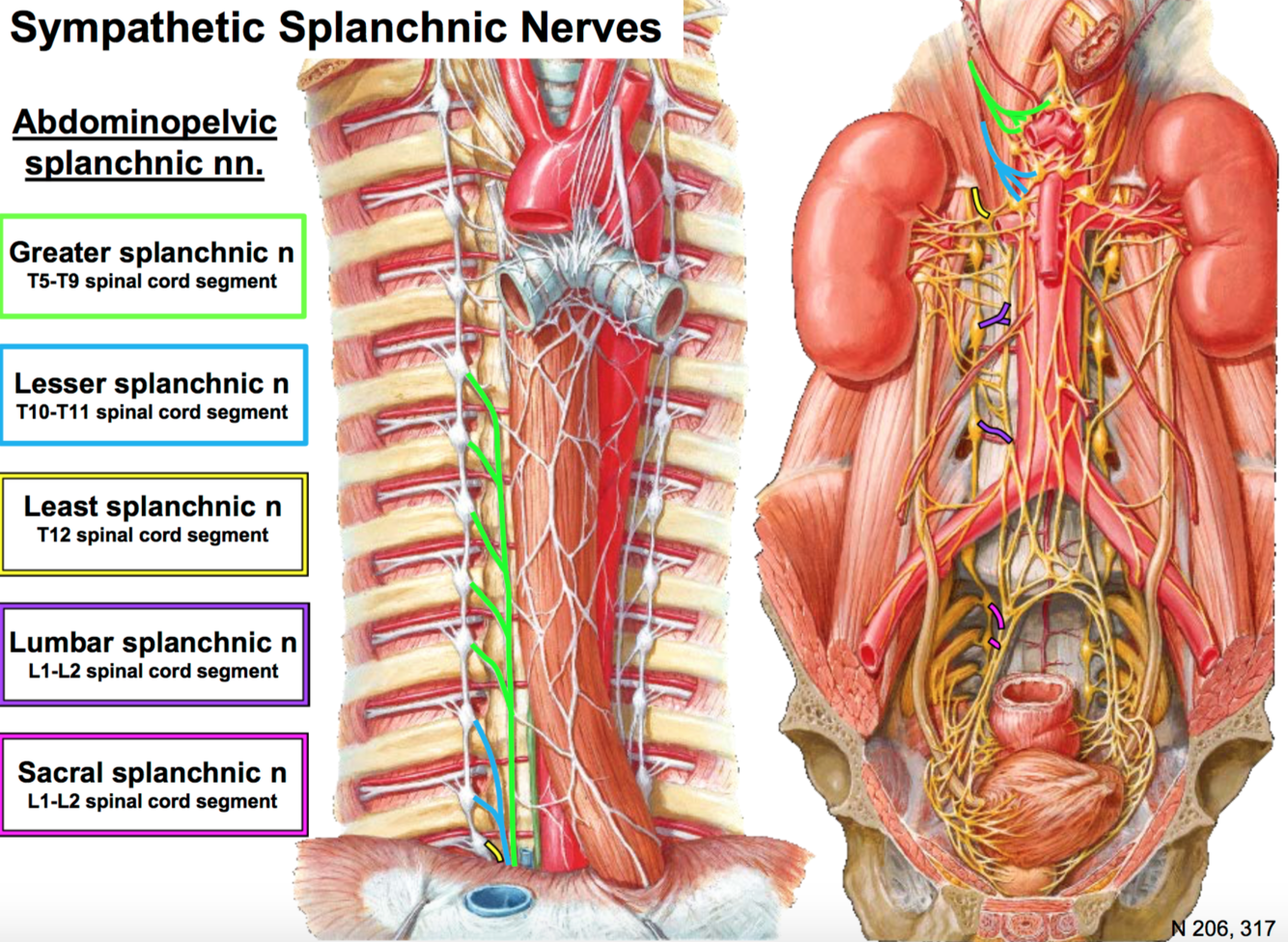Major sphlanchnic nerves and associated spinal nervous supplies