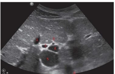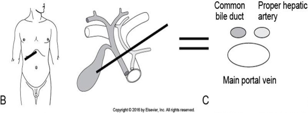 Where is the Common hepatic duct located anatomically in relation to the PV and the right hepatic artery?