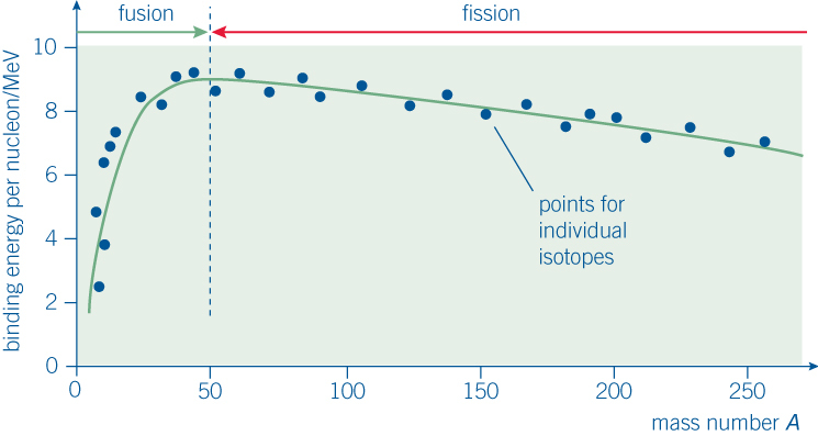 Two smaller nuclei combine together to form a larger nucleus. If fusion occurs, the product nucleus (A < 50) has more binding energy per nucleon than the smaller nuclei. Fusion starts with two small nuclei on the left and moves to the right upwards towards the peak.