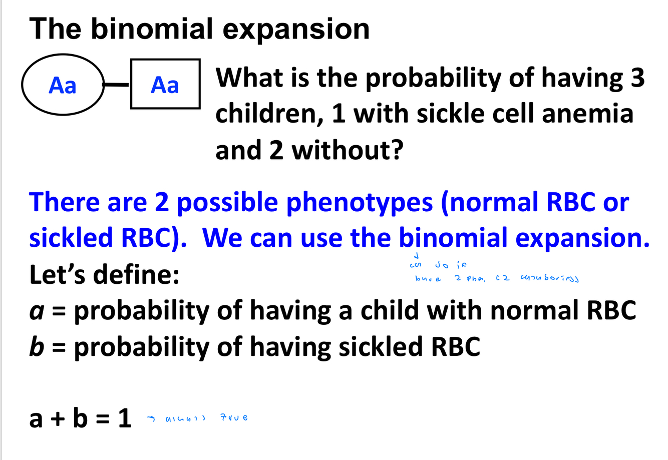 Example – what is the probability that one of three children has sickle cell – parents are Aa X Aa