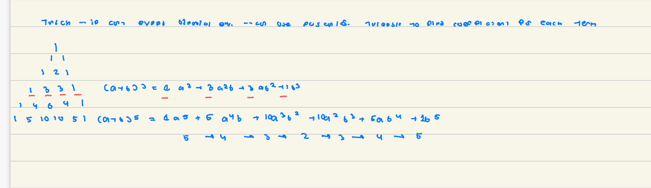 If can’t expand because don’t remember coefficants –> can use pascals trainge to find the coefficient for each term