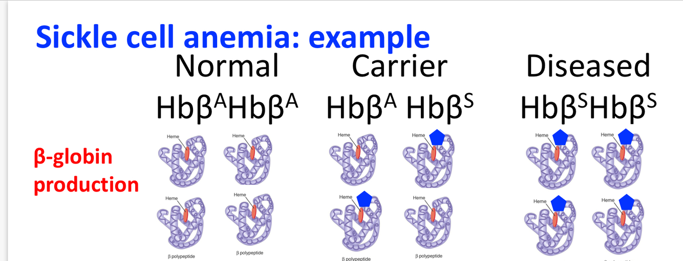 The heteozygous genotype leads – bith versions of beta globine (get the one with heme AND the one without) – because have BOTH dominent and recssive phonetypes NOT some intermediate version = co-dominnet (see both dominent and recssive fully)