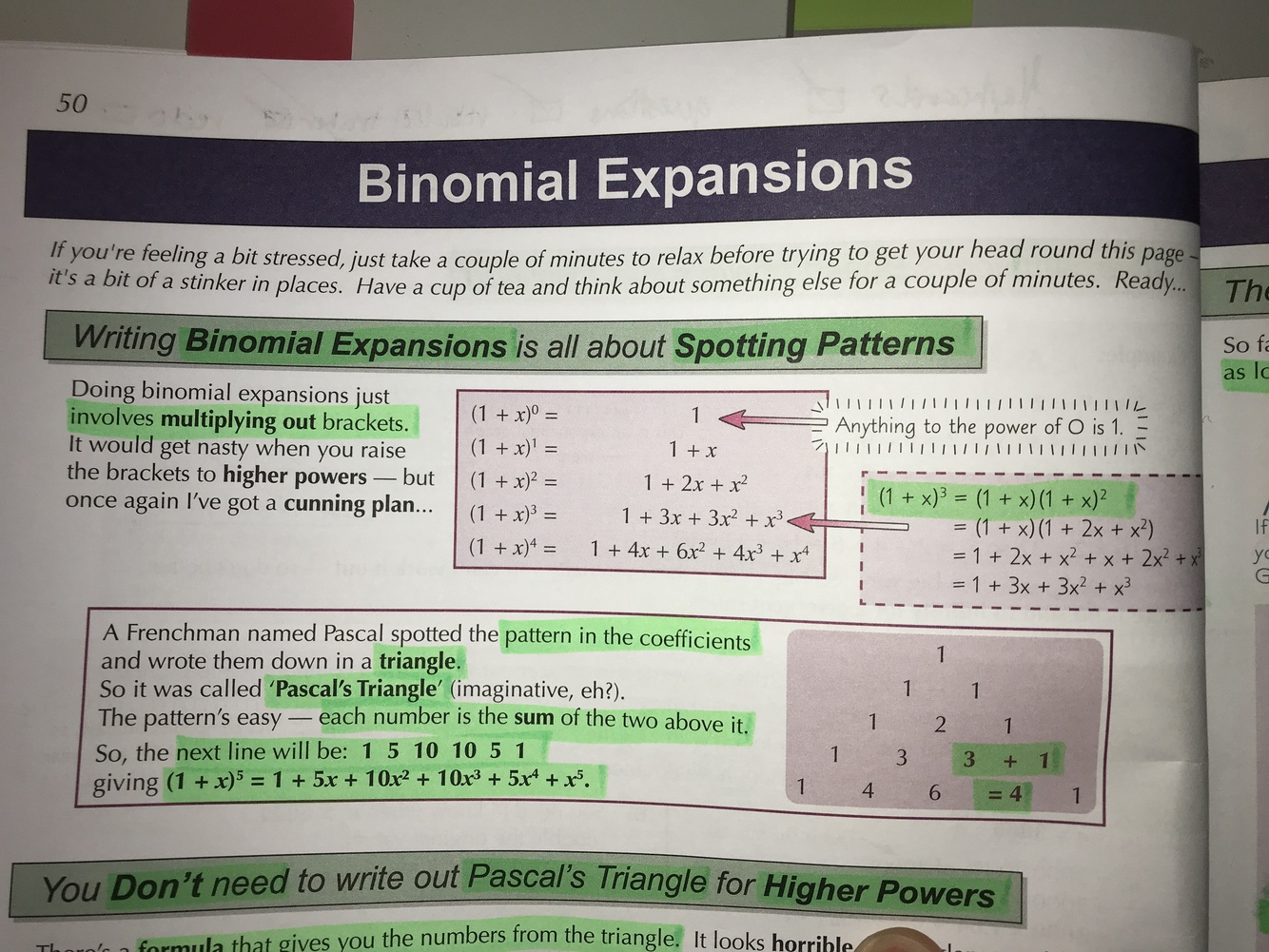 Binomial expansions is a pattern: explain Pascal’s triangle.