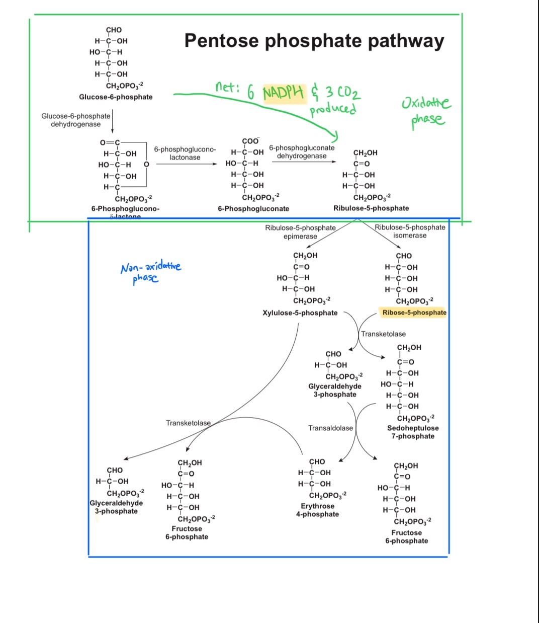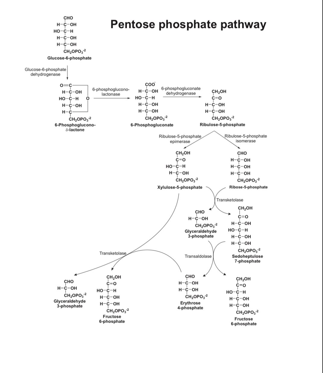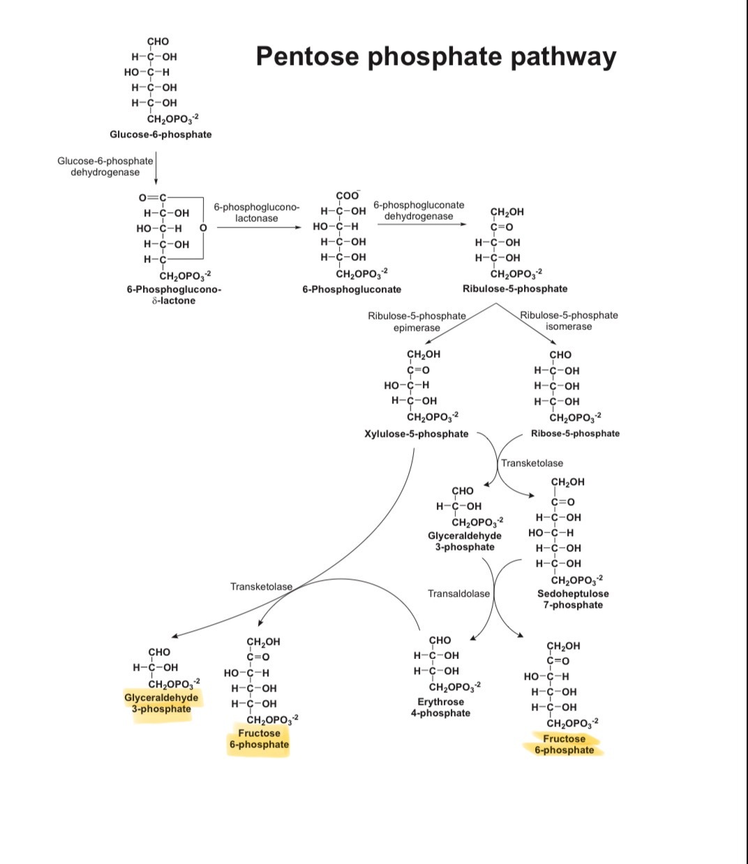 → excess xylulose-5-P and ribose-5-P converted to fructose-6-P and glyceraldehyde-6-P