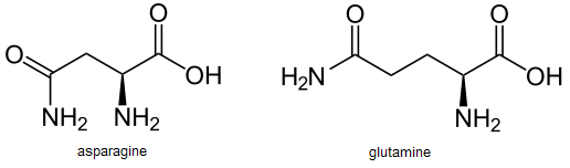 Both have terminal carboxamide (-C=ONH2) groups in their side chains, but Gln’s side chain is one CH2 group longer than Asn’s.