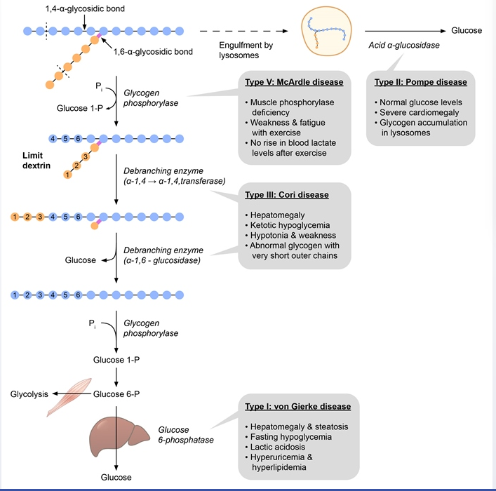 Cytosolic accumulation of glycogen with abnormally short outer chains = limit dextrans