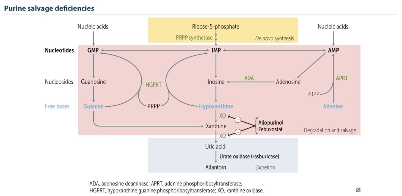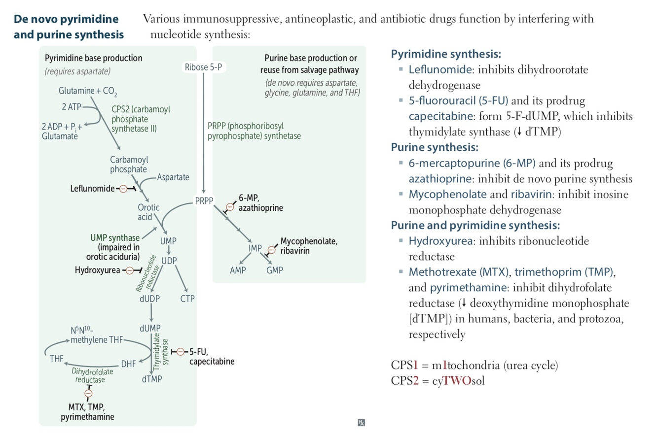 Walk through the pyrimidine and purine synthesis pathway in your head explaining the different points important for pathology.