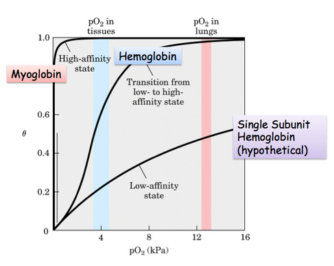 As demonstrated by the graph a single subunit has very low affinity even as pO2 increases and only reaches about 50% saturation. Contrast this to the rapid rise of hemoglobin, once activated from the T to the R state it quickly is able to bind O2 easily.