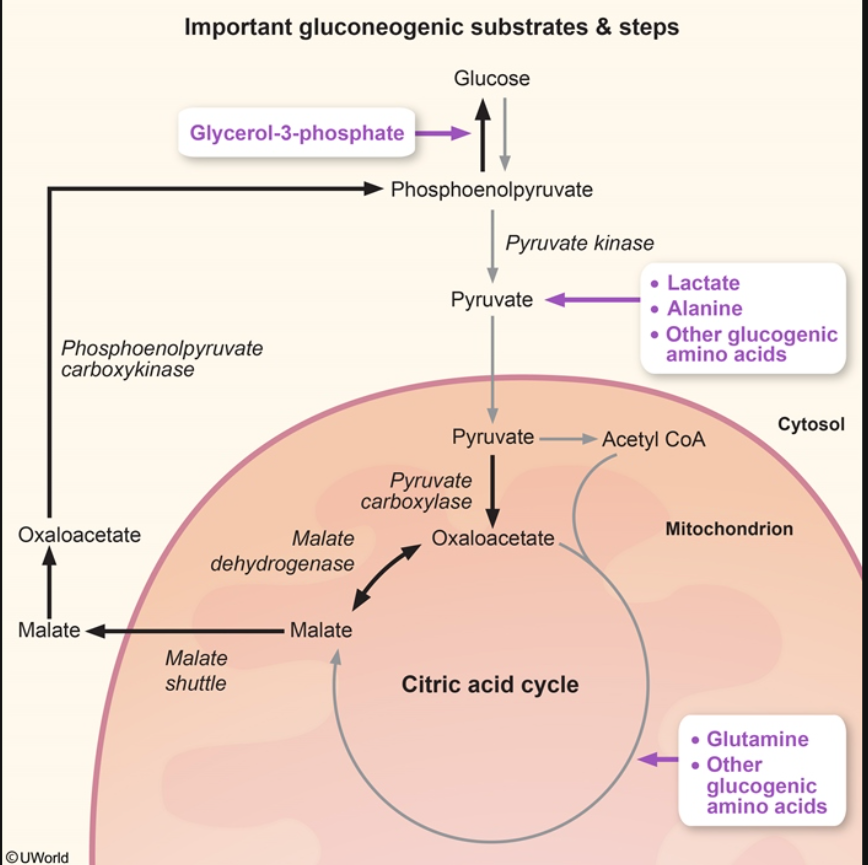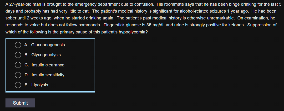 Alcohol does not inhibit glycogenolysis (Choice B), and so in the initial phase of binge drinking (heavy alcohol intake with reduced nutritional carbohydrate intake), hepatic glycogenolysis is able to maintain euglycemia. However, after a prolonged binge, hepatic glycogen is eventually depleted and blood glucose levels drop.