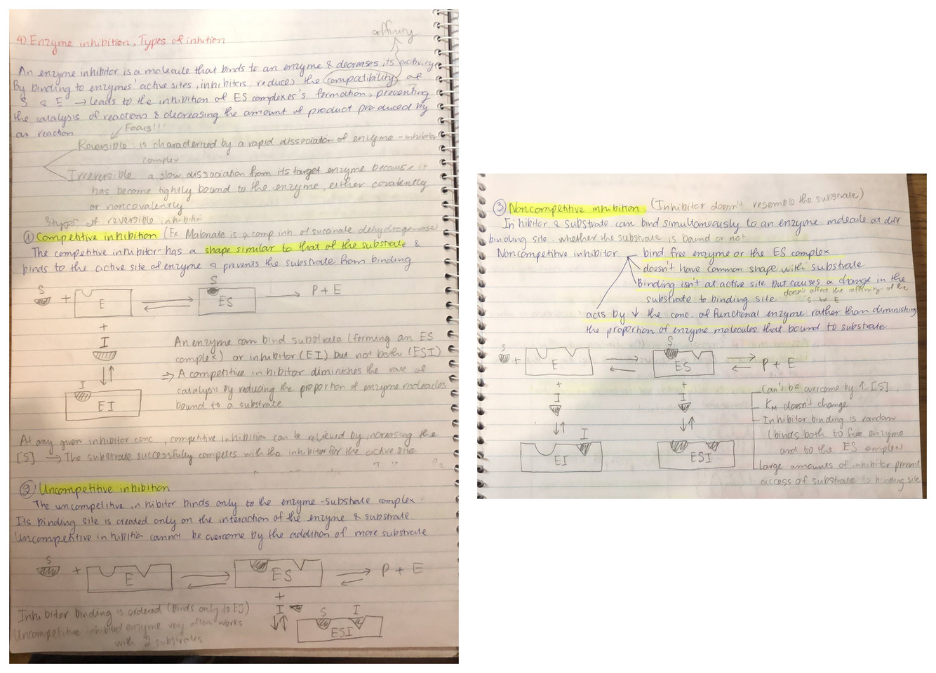 Noncompetitive inhibition: Noncompetitive inhibitors change the shape of the active site —> Substrate can still bind to enzyme but the reaction is blocked