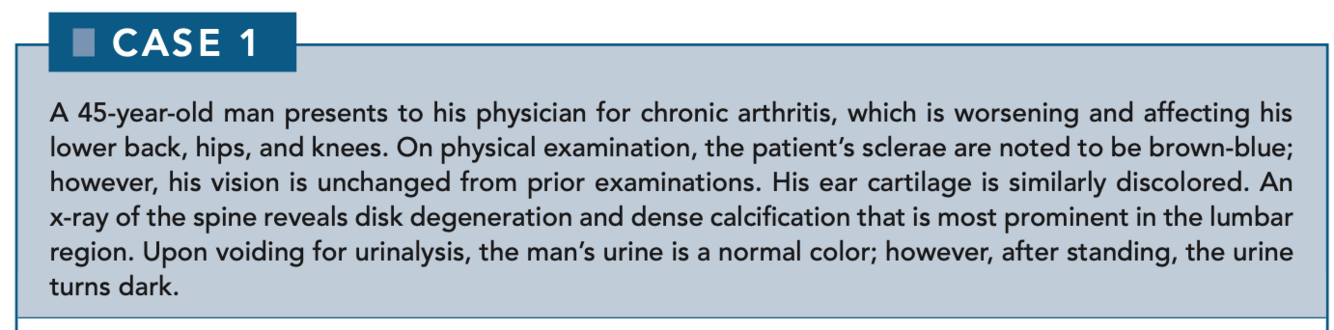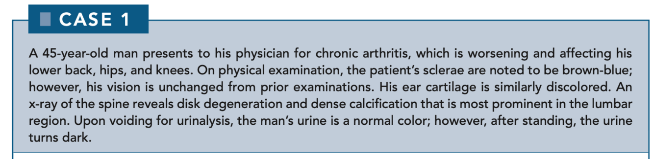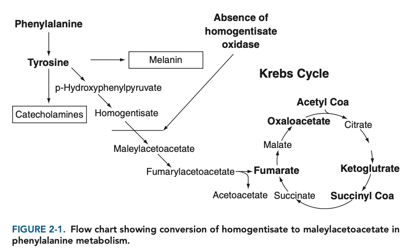 Alkaptonuria is characterized by the absence of homogentisate oxidase, an enzyme of tyrosine metabolism that catalyzes the conversion of homogentisate to maleylacetoacetate (Figure 2-1). The accumulation of homogentisate in cartilage leads to arthritis as well as to the discoloration of sclerae and other areas of the body.