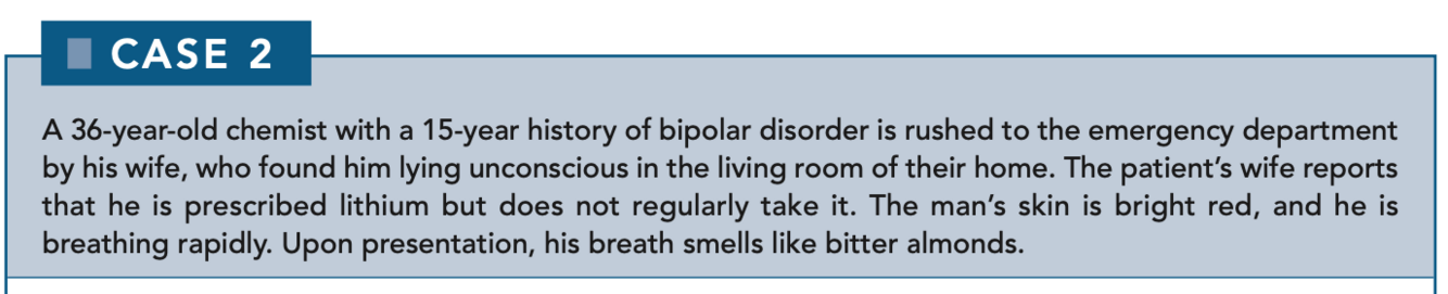 This man has ingested cyanide (the “bitter almond” breath is pathognomonic). During a manic episode, patients with bipolar disorder are more likely to use illegal drugs and engage in self-injurious behavior so a toxicology screen is mandatory. Other causes of unconsciousness, including dehydration, metabolic acidosis, and diabetic ketoacidosis, should be investigated.