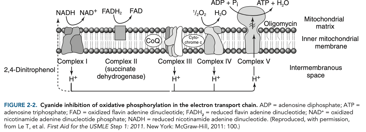 Cyanide is a direct inhibitor of one step in the electron transport chain (Figure 2-2). Cyanide inhibits cytochrome oxidase.