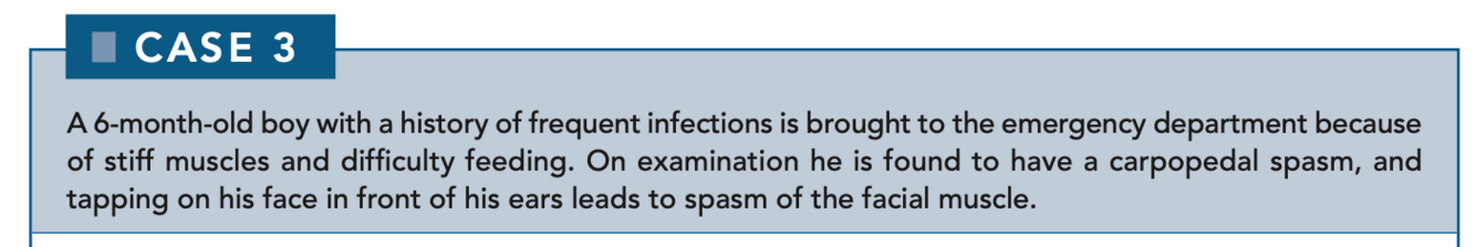 This child has DiGeorge syndrome (22q11 syndrome), which is characterized by hypoparathyroidism and T-cell deficiency. Severe combined immunodeficiency may cause both B- and T-cell deficiencies or T-cell deficiency exclusively in a given host. Hyper-IgM syndrome, IgA deficiency, and Bruton agammaglobulinemia all primarily affect B cells.