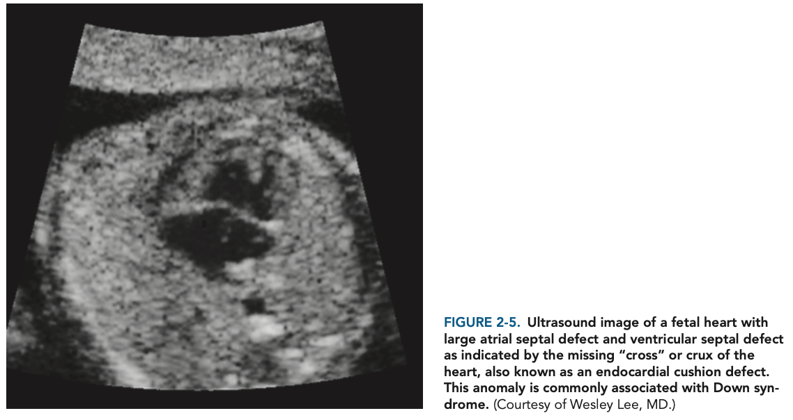 A single palmar crease; small, folded ears; a short neck; Brushfield spots (pale yellow spots on the iris); and a gap between the first and second toes. They also suffer from heart disease, most often cardiac cushion malformations (Figure 2-5), and may have ophthalmologic problems, gastrointestinal tract malformations, poor hearing, and mental retardation. Males with Down syndrome are almost always infertile.