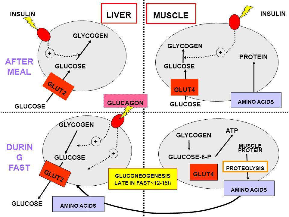 GLUT 4 is saturated when glucose levels are only slightly above 5 mM so glucose entry can only be increased by increasing the number of transporters. Insulin promotes the fusion vesicles containing preformed GLUT 4 with the cell membrane.