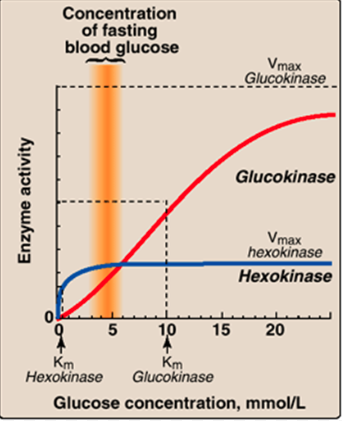 Widely distributed in tissues and is inhibited by its product, glucose-6-phosphate * Found only in liver cells and pancreatic b islet cells; in the liver glucokinase is inhibited by insulin. Also because the GLUT transporters are specific for glucose( not phosphorylated glucose), the glucose gets trapped in the cell and can’t leak out.
